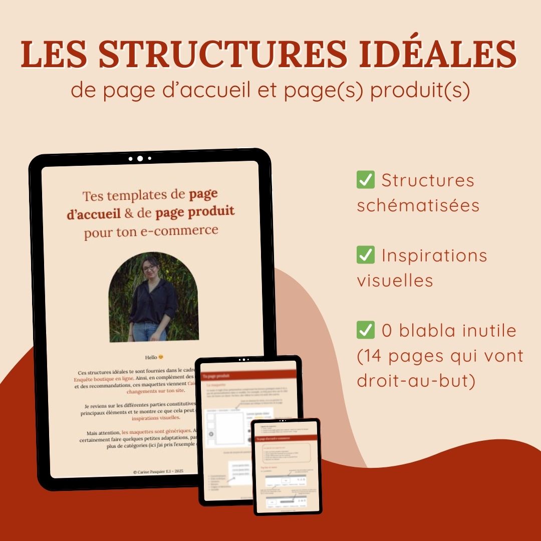 Je t’ai schématisé et structuré mes connaissances d’UX Designeuse ecommerce, afin que la construction de tes pages clés ne soit plus un cauchemar ou un projet éternellement repoussé. Objectifs d’une page d’accueil Structure globale de ta page d’accueil et de ta page produit Inspirations & bonnes pratiques pour ta page d’accueil et ta page produit Blocs expliqués un par uns Schéma(s) clairs et facilement compréhensibles 14 pages qui vont droit-au-but (les schémas sont si clairs qu’il ne reste pas grand chose à dire !) Personnalisable pour toutes les activités e-commerce